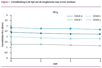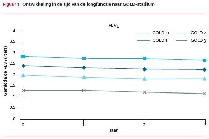 Kwaliteit van leven vormde de afhankelijke variabele, spirometriegegevens de onafhankelijke variabele. Uit de spirometriegegevens betrokken wij FEV1 en FVC, en berekenden wij FEV1/FVC en FEV1 als percentage van de voorspelde waarde conform de ECCS-referentiewaarden.8 Wij classificeerden de deelnemers post hoc volgens de stadiëring van het Global Initiative for Chronic Obstructive Lung Disease (GOLD-stadium 0 = ‘at risk’; 1 = licht COPD; 2 = matig ernstig COPD; 3 = ernstig COPD; 4 = zeer ernstig COPD). Wij combineerden de patiënten in GOLD-stadia 3 en 4 wegens hun kleine aantal. Progressie van bronchusobstructie berekenden wij op basis van de individuele FEV1-waarden in de loop van de onderzoeksperiode. In een eerste analyse berekenden we voor ieder baseline GOLD-stadium de gemiddelde CRQ-score. De verschillen in CRQ-score tussen verschillende GOLD-stadia analyseerden wij met de t-toets. In een tweede analyse keken wij naar de verschillen in CRQ-scores tussen begin en eind van de onderzoeksperiode, en in derde instantie vergeleken wij de CRQ-scores van patiënten die in de loop van de onderzoeksperiode naar tenminste één hoger (ernstiger) GOLD-stadium opschoven met de scores van patiënten die GOLD-stabiel bleven.