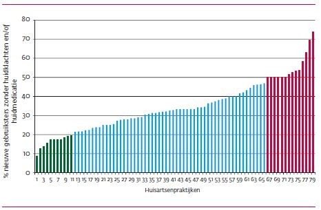 Wanneer vrouwen geen indicatie of medicatie hadden voor huidklachten was er mogelijk sprake van off-labelgebruik van de Diane-35-pil of een generieke variant. Het percentage van alle nieuwe gebruiksters dat deze medicatie mogelijk off-label kreeg voorgeschreven in de periode 2002-2011 verschilt aanzienlijk tussen huisartsenpraktijken. Dit aandeel lag tussen de 9% en 74% van alle nieuwe Diane-35-gebruiksters [figuur]. Van de 80 praktijken in de analyses hadden er 11 een aandeel van minder dan 20% nieuwe gebruiksters zonder aanwijzing voor huidklachten. Daartegenover staan 14 praktijken waar meer dan de helft van de nieuwe gebruiksters geen aanwijzing had voor huidklachten. Praktijkkenmerken zoals praktijkvorm, al dan niet apotheekhoudend zijn, en regio (noord/oost/west/zuid) bleken niet samen te hangen met de mate van off-label voorschrijven.