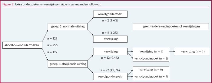 Figuur 2 laat zien welk beleid de huisartsen voerden in de zes maanden na de eerste laboratoriumuitslag. Voor 22 (17,3%) patiënten uit groep 1 en 2 (1,6%) patiënten uit groep 2 vroegen zij vervolgonderzoek aan (p < 0,001). Zij verwezen 12 (9,4%) patiënten uit groep 1 en 8 (6,2%) patiënten uit groep 2 naar een specialist (p = 0,33). Slechts 6 (4,7%) patiënten kregen meer dan één extra onderzoek of verwijzing, en 1 (0,8%) patiënt kreeg er meer dan twee.