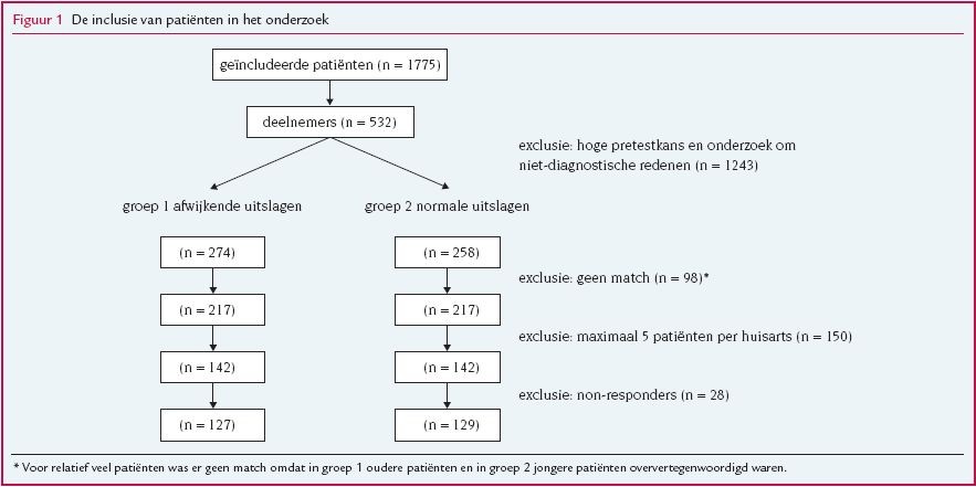 Bij aanvang deden 87 huisartsen mee aan het onderzoek, van wie er tijdens de follow-upperiode 8 uitvielen om diverse redenen. Van de huisartsen was 67% man, 34% ouder dan 50 jaar en werkte 54% full-time. Aan het eind van de zes maanden follow-up verkregen wij van de overgebleven 79 huisartsen de gegevens van 142 patiënten met een afwijkende uitslag (groep 1), en van 142 gematchte patiënten met een normale uitslag (groep 2). Van 28 patiënten waren de follow-upformulieren niet compleet ingevuld, zodat we uiteindelijk 127 patiënten met een afwijkende uitslag konden analyseren, en 129 patiënten met een normale uitslag (figuur 1). De twee groepen waren vergelijkbaar voor wat betreft leeftijd, geslacht en pretestoverwegingen van de huisarts (tabel 1).