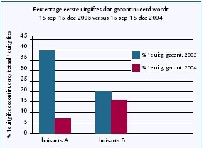 Als de praktijk drie maanden volgens de protocollen heeft gewerkt, vraagt zij de apotheker om het aantal voorschriften in die periode te vergelijken met de cijfers van het jaar daarvoor. Het totaalaantal voorschriften was slechts met 2 procent afgenomen. Maar het aantal tabletten per eerste voorschrift daalde van 27,7 naar 21,6. Bovendien nam het percentage recepten dat na eerste uitgave werd gecontinueerd af met 81 procent: van 39,3 procent in 2003 naar 7,4 procent in 2004.