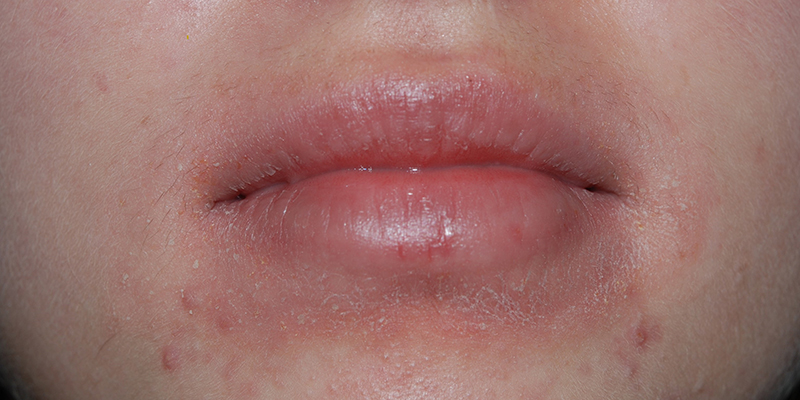 Meestal volstaat lokaal onderzoek. Bij inspectie van de mond ziet men perioraal een scherpbegrensde, erythematosquameuze huiduitslag, waarvan de begrenzing overeenkomt met de reikwijdte van de tong [figuur 1]. Soms is het eczeem alleen aanwezig op de omliggende huid tot aan het lippenrood, maar meestal is ook het lippenrood zelf aangedaan. De lippen zijn droog, vertonen kloofjes en soms zijn er bloedkorstjes.
