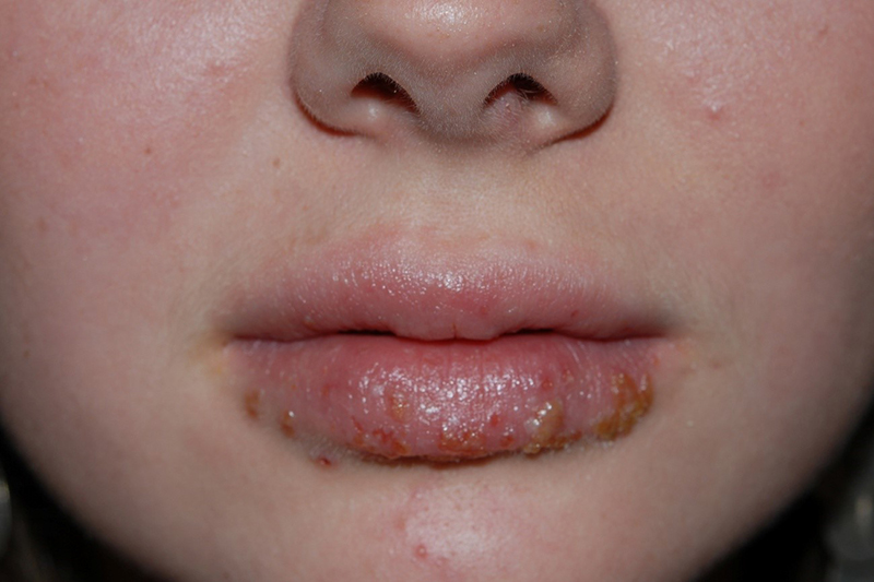 Geïmpetiginiseerd liplikeczeem. Boven de mond is een milde erythemateuze huiduitslag zichtbaar, op de rand van de onderste lip bevinden zich honinggele crustae.