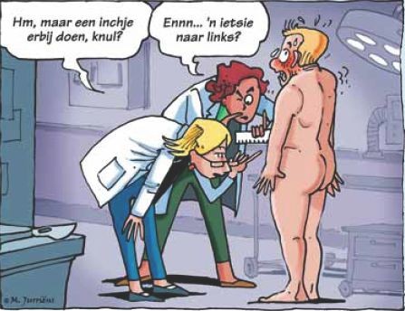 Nou ja, de moderne tijd, kun je dan zeggen. Je kunt het krijgen zoals je het hebben wilt. Het is weer feestmaand en dan kopen we ook allerlei spullen die we heel erg niet nodig hebben. Maar… het zijn wel artsen die zich hiervoor lenen. Die moeten toch ook (diep van binnen?) dezelfde reactie hebben als gewone mensen: je gaat toch niet snijden in een lichaam waar niets aan mankeert?! Waarom schrijven en roepen niet veel meer medici dat hun professie en hun eed daarvoor niet zijn bedoeld? Waarom zeggen huisartsen niet openhartig in de spreekkamer dat ze het onzin vinden als een leuke jongen zegt nóg leuker te willen worden door zijn neus drie graden naar links te laten verplaatsen? En waarom wordt er niet meer ruchtbaarheid gegeven aan de ‘tegenvallende ingrepen’?