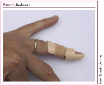 Gunstig effect. Warren et al. (n=116) vergeleken de Stack-spalk met een ander type spalk: de Abouna-spalk.13 Zij beoordeelden het resultaat conform de strengere criteria van Abouna & Brown. Hierbij was er sprake van succes bij een extensieverlies 15°. Er werd geen verschil in verbetering of volledige genezing vastgesteld (OR 0,9; 95%-BI 0,85-1,06). Kinninmonth et al. (n=54) vergeleken de Stack-spalk met een geperforeerde spalk.14 Ook zij vonden geen verschil (OR 0,24; 95%-BI 0,02-2,51). Maitra et al. deden een vergelijkbaar onderzoek (n=60); hierbij werd de Stack-spalk vergeleken met een speciaal aangepaste aluminium spalk.15 Er was geen verschil in gunstige resultaten (OR 1,14; 95%-BI 0,41-3,16) Wel waren er bij de spalk die aan de patiënt was aangepast minder huidlaesies (OR 0,14; 95%-BI 0,03-0,73) Nadelig effect. Bij de Stack-spalk kwamen meer huidlaesies voor.