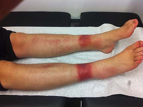 45 Van geen enkele factor is echter bewezen dat deze bijdraagt aan het ontstaan van capillaritis. Er is geen associatie met hematologische afwijkingen zoals trombocytafwijkingen of stollingstoornissen. Bij deze patiënt was de toegenomen beweging de vermoedelijke oorzaak. Het klinisch beeld liet geel- en roodbruine, niet-wegdrukbare maculae zien. Het niet-wegdrukbare aspect is het gevolg van de neerslag van hemosiderine. De aandoening zit meestal op de onderbenen, maar kan ook op andere delen van het lichaam voorkomen. Typisch is dat handpalmen, voetzolen, gelaat en genitaliën daarbij worden gespaard.