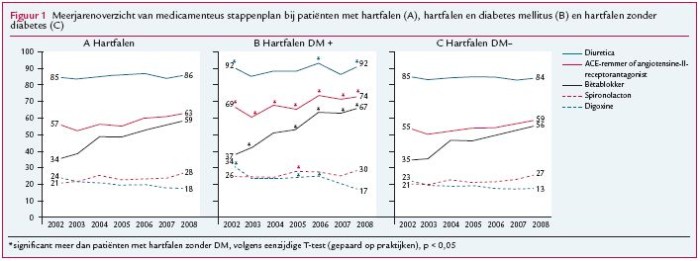 In een huisartsenpraktijk met 2350 patiënten zijn er per jaar ongeveer 28 patiënten met hartfalen, van wie 7 nieuwe patiënten (alle leeftijden). De optimale zorg voor deze patiënten staat in de NHG-Standaard Hartfalen (herzien in 2005). De standaard beschrijft onder andere een medicamenteus stappenplan. Met behulp van LINH-gegevens inventariseerden wij voor de afgelopen jaren in hoeverre de zorg van huisartsen overeenkomt met de aanbevelingen over medicatie in de standaard. We maakten daarin onderscheid tussen patiënten met hartfalen en diabetes en patiënten met hartfalen zonder diabetes. Patiënten met hartfalen en diabetes zijn mogelijk beter in beeld bij de huisarts door deelname aan diabeteszorgprogamma’s dan patiënten met hartfalen zonder diabetes. Onze verwachting was dat de behandeling van de patiënten met hartfalen en diabetes meer overeenkomt met de aanbevelingen van de standaard.