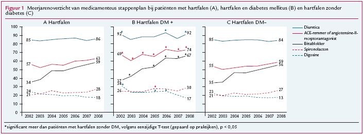 De eerste stap bij hartfalen is het voorschrijven van een diureticum met een ACE-remmer (of angiotensine-II-receptorantagonist bij bijwerkingen). Afhankelijk van de ernst kan de huisarts stapsgewijs extra medicatie voorschrijven: respectievelijk een bètablokker, spironolacton en digoxine. Diuretica werden de afgelopen jaren het meest voorgeschreven (zo’n 85%, figuur 1A). Het gebruik van ACE-remmers is de laatste jaren licht toegenomen (tot 63%); de standaard adviseert het gebruik bij nagenoeg alle patiënten met hartfalen. Het voorschrijven van bètablokkers was nieuw in de standaard in 2005 en is bijna verdubbeld: van 34% in 2002 naar 59% in 2008. Ook het voorschrijven van spironolacton is iets toegenomen. Digoxine werd van oudsher voorgeschreven, maar vormt nu de laatste stap in het medicatieplan en wordt iets minder voorgeschreven dan in 2002. We vergeleken voor elk jaar de medicatie van patiënten met hartfalen en diabetes (figuur 1B) met die van patiënten met hartfalen zonder diabetes (figuur 1C). We vonden significante verschillen voor alle medicatiestappen, maar vooral voor ACE-remmers en bètablokkers. Patiënten met hartfalen en diabetes kregen gemiddeld 14% vaker een ACE-remmer en 8% vaker een bètablokker dan patiënten met hartfalen zonder diabetes.