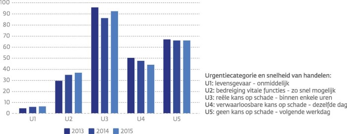 De toename in het aantal contacten met een hoge urgentie was het grootst voor U2-consulten (zo snel mogelijk contact), met een toename van 34%. In 2013 bedroeg dit aantal 15,6 per 1000 inwoners, in 2015 waren dit er 20,9 per 1000 inwoners. Een toename van het aantal U2-contacten betekent dat huisartsen sneller zorg moeten leveren dan voor laagurgente zorgvragen. Ook was er een sterke toename van het aantal U1-contacten. Meestal worden U1-contacten telefonisch afgehandeld, omdat deze patiƫnten vooral worden doorgestuurd naar de ambulancedienst. Het probleem van hoge ervaren werkdruk op de huisartsenpost bleek ook uit de peiling van de Landelijke Huisartsen Vereniging. Het is daarom belangrijk om de ontwikkelingen op de huisartsenpost te blijven monitoren.