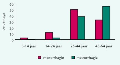 Er zijn 288 vrouwen geselecteerd. Negen vrouwen vielen uit omdat er geen dossier gevonden kon worden. Uiteindelijk zijn er 279 vrouwen geïncludeerd. Van deze 279 vrouwen kregen 130 vrouwen de diagnose metrorrhagie en 149 vrouwen de diagnose menorrhagie. Menorrhagie komt het meest in de leeftijd 25-44 jaar voor en metrorrhagie stijgt met de leeftijd ( figuur 1). De gemiddelde volgduur was 9 jaar en 4 maanden (range: 1 maand-10 jaar). Eenenzeventig procent was gedurende de volledige onderzoeksperiode te vervolgen.