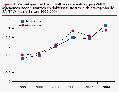 In totaal onderzochten we 191.952 uitstrijkjes. Van 1999 tot 2004 steeg het percentage uitstrijkjes afgenomen door doktersassistentes van 9 tot 21%. Het percentage Pap-0-uitstrijkjes bedroeg over de 6 onderzochte jaren voor de doktersassistentes 2,4% en voor huisartsen 2,1% (p=0,001, tabel 1). In de tijd liepen deze percentages enigszins, maar significant op (pfiguur 1).