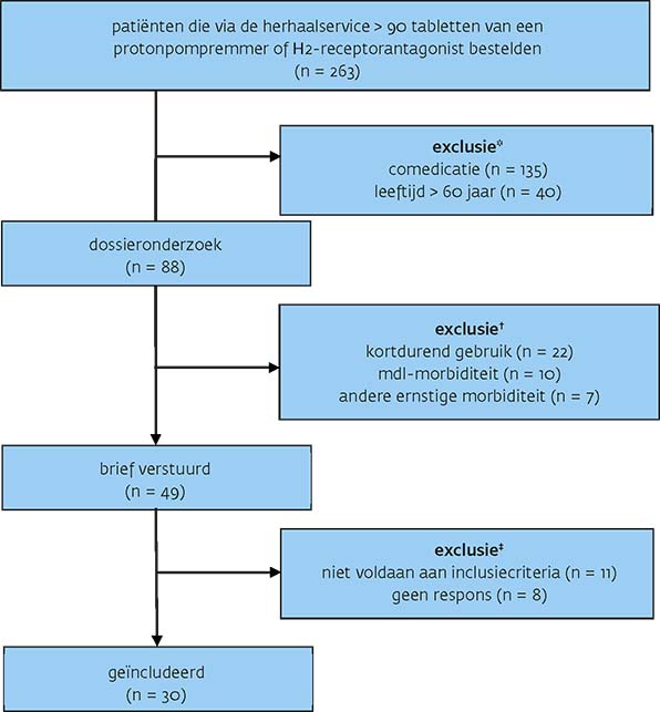 De [figuur] laat de inclusieprocedure van ons implementatieonderzoek zien. In het HIS selecteerden we alle ‘chronische gebruikers’, dat wil zeggen patiënten die tussen 1 september 2015 en 1 maart 2016 via een herhalingsrecept meer dan negentig tabletten van een maagzuurremmer besteld hadden. Dit waren er 263. Uit efficiëntieoverwegingen includeerden we alleen de 223 patiënten die jonger waren dan 60 jaar, want boven die leeftijd komt relatief veel comorbiditeit en polyfarmacie voor, wat reden zou zijn voor exclusie. Uit deze groep excludeerden we 135 patiënten die ook andere medicatie gebruikten. In de 88 dossiers die overbleven zochten we naar een herleidbare indicatie zoals oesofagitis of een andere ernstige aandoening.