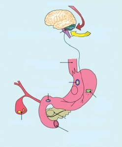 Via misselijkheid en braken probeert het lichaam de inname en opname van schadelijke stoffen te voorkomen. Via zien, ruiken en proeven kan misselijkheid worden opgewekt. Braken wordt gereguleerd vanuit het braakcentrum. Het braakcentrum ontvangt informatie uit verschillende bronnen: de cortex cerebri, het cerebellum (vestibulair), de chemoreceptortriggerzone (CTZ) in de hersenstam en chemoreceptoren in het maagdarmkanaal ( figuur 1). Bij misselijkheid neemt de functie van de maag af: de motiliteit wordt trager, de maagzuursecretie vermindert, de speekselvorming neemt toe en via retroperistaltiek wordt het voedsel vanuit het duodenum naar boven geduwd. Bij braken treedt een krachtige contractie op van de buikspieren terwijl tegelijkertijd de slokdarmsfincter zich ontspant. 2,10