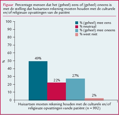 De meningen over dit onderwerp zijn sterk verdeeld. Bijna de helft (49%) van de panelleden is het eens met de stelling: ‘Huisartsen moeten rekening houden met de culturele en/of religieuze opvattingen van de patiënt’ (zie de figuur). Tegelijkertijd vindt ruim een kwart (27%) van de panelleden dat culturele en religieuze opvattingen van de patiënt geen enkele rol moeten spelen. Of mensen zichzelf tot een bepaalde kerk of geloofsgemeenschap rekenen, maakt geen verschil. Ook in 2000 was men het al niet met elkaar eens, hoewel iets meer respondenten het eens waren met de stelling dan in 2007 (54%).