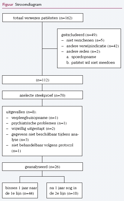 Tussen januari en oktober 2001 verwezen huisartsen 162 patiënten met DM2 door naar de Isala Klinieken. Van ons onderzoek sloten we 49 patiënten uit: 42 vanwege een andere verwijsindicatie dan disregulatie van de glucose, hypertensie of een afwijkend vetspectrum, 5 patiënten zijn nooit op het spreekuur verschenen, één patiënt is met spoed opgenomen waardoor poliklinische behandeling niet gestart is en één patiënt wilde niet deelnemen aan het onderzoek. Van de 112 patiënten die overbleven hebben we aan de hand van een randomisatietabel een aselecte steekproef genomen van 70 patiënten. Er vielen 5 patiënten tijdens de behandeling uit wegens opname in een verpleeghuis, psychiatrische problematiek, uitstappen uit eigen initiatief en uitgebreide comorbiditeit. Bij deze vijf patiënten was een protocollaire behandeling niet mogelijk. Van 3 patiënten waren tijdens de analyse geen gegevens beschikbaar. Uiteindelijk includeerden we 62 patiënten voor analyse (figuur). Van de 62 patiënten hadden 58 patiënten de verwijsindicatie disregulatie van de glucosehuishouding, zonder dat in de verwijsbrief nog een andere reden van verwijzing genoemd werd. Eén patiënt werd verwezen vanwege hypertensie bij een goede glucoseregulatie en bij 3 patiënten was een afwijkend vetspectrum de verwijsreden. Bij één patiënt werden in de verwijsbrief bijwerkingen op statines als probleem genoemd.