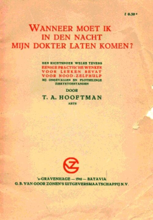 Aan het begin van de oorlog, zo rond de februaristaking, publiceerde Hooftman een boekje met wijze raad voor leken. Zich zonder verlof op straat begeven in de verboden uren, was immers niet zonder gevaar, zo meldt hij in het voorwoord. ‘In het algemeen kan geconstateerd worden, dat zulks in normale tijden reeds dikwijls onnoodig geschiedde.’ Dat moest nu maar eens afgelopen zijn. De patiënt trieert zelf en als die overleed? Niet erg: ‘afleggen van den doode; kin ondersteunen met een stevig opgerold servet; oogen sluiten. De arts kan dan niets meer doen en is zijn snelle komst dus onnoodig.’ De eerste algemene gedragsregel luidt: ‘Laat u niet door angst of schrik geheel in de war brengen…’ De dokter was er toen al ook ter bezwering van de angst. Een nuttig boekje. (JZ)