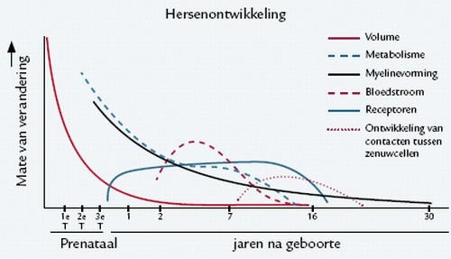 Hoogervorst zei tijdens de opening van het congres al iets over de schadelijkheid van alcohol voor de ontwikkeling van de hersenen, maar hoe komt dat dan en hoe groot is die schade? Dat wordt haarfijn uit de doeken gedaan door Guus Smit, hoogleraar Moleculaire en Cellulaire Neurobiologie aan de VU. ‘Sinds kort weten we dat hersenen een heel lange ontwikkeling doormaken die door allerlei stoffen, waaronder alcohol, kan worden beïnvloed.’ Het effect van die stoffen op de hersenen kan acuut zijn (alchol en dronkenschap), maar ook op langere termijn plaatsvinden; dit laatste is ingrijpender en gevaarlijker. Er is onderzoek gedaan onder adolescenten met excessief alcoholgebruik. Zij hadden een 10 tot 35 procent kleinere hippocampus – en daarin dus minder cellen – dan de controlegroep en ze vertoonden minder hersenactiviteit tijdens geheugentaken. ‘Vroeger dachten we dat de ontwikkeling van de hersenen voorbij was na de kinderjaren, maar dat is niet zo. We weten nu dat de hersenontwikkeling niet compleet is voor het 24ste levensjaar, en in de laatste fase gaat het vooral om de prefrontale cortex.’ Vanaf de geboorte worden hersengebieden deel voor deel voor hun specifieke functies toegerust. Dat gaat letterlijk ‘van achteren naar voren’: achter in de hersenen sensorisch, vervolgens motivatie, dan emotie en tot slot voor in de hersenen de besluitvorming. Het proces is zichtbaar in een volumetoename van de betreffende hersengebieden, maar vooral ook in de daar gemeten activiteiten (zie ook onderstaand schema). Smit is zo vriendelijk het zo uit te leggen, dat iedereen begrijpt hoe het werkt. Crux is de ‘bedrading’, ofwel de ontwikkeling van contacten tussen zenuwcellen via ‘contactplaatsen’ (neurotransmitters). Bij de geboorte zijn er veel meer contactplaatsen in de hersenen dan we nodig hebben. Bij het leren en aanscherpen van de diverse functies wordt het benodigde ‘netwerk’ aangelegd doordat de contactplaatsen die wel nodig zijn worden geactiveerd en instandgehouden, en de contactplaatsen die niet nodig zijn worden afgekapt. Dat is onomkeerbaar: wat eenmaal is afgekapt kan niet meer worden geactiveerd. Het proces is ook ‘van buitenaf’ zichtbaar. Als een peuter leert lopen gaat er nog van alles mis: het kind zoekt naar evenwicht, struikelt en valt om de haverklap. Gestaag kappen de hersenen die contactplaatsen af die niet nodig zijn voor ‘goed kunnen lopen’ tot alleen dat overblijft wat nodig is om recht en stabiel van A naar B te komen. Tijdens de puberteit zijn de voorgaande ontwikkelingsfasen nog niet afgerond, maar bovenal komt dan het activeringsproces in de prefrontale cortex op gang: het gebied waar de beslissingen worden overwogen en genomen, ofwel waar het ‘fijnere denkwerk’ wordt verricht. Ook dit is zichtbaar van buitenaf: pubers gaan niet voor niets op zoek naar grenzen en zich daarbij impulsief en roekeloos gedragen (struikelen en vallen). Alcoholgebruik in déze fase, waarin de hersenen nog volop in ontwikkeling zijn en zich klaarmaken voor hun meest ingewikkelde taak, is funest. Want alcohol beïnvloedt de normale ontwikkeling en daarmee ook het latere gedrag. Deze schade is onomkeerbaar, dus helpt er maar een ding: voorkomen.