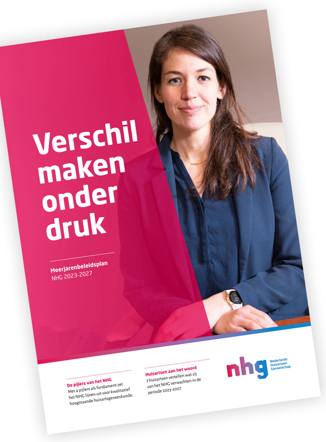 In het NHG meerjarenbeleidsplan 2023-2027 staat hoe het NHG met vier pijlers als fundament lijnen uitzetvoor kwalitatief hoogstaande huisartsgeneeskunde. Drie thema’s krijgen extra aandacht, omdat het vraagstukken zijn waarvan het bestuur, leden en medewerkers vinden dat die extra aandacht van het NHG verdienen.