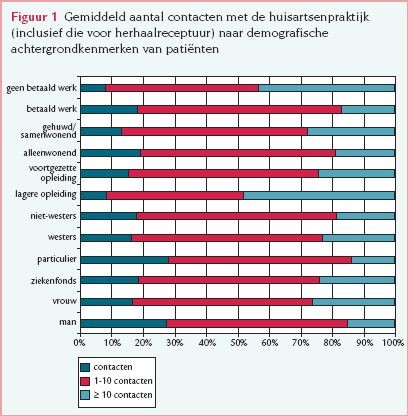 Ongeveer 20% van alle Nederlanders heeft in een jaar geen enkele keer contact met de huisartsenpraktijk, ook niet voor een herhaalrecept; eveneens 20% heeft 10 keer of vaker contact en voor de overige 60% is de jaarlijkse frequentie 1 tot 10 keer. Personen die vaak de huisarts consulteren (10 keer of meer per jaar) verschillen significant van personen die minder vaak naar de huisarts gaan. Degenen met 10 of meer contacten met de huisartsenpraktijk zijn gemiddeld ouder, en zijn relatief vaker vrouw, ziekenfondsverzekerd, lager opgeleid, behoren vaker tot een huishouden van 2 of meer personen en hebben vaker geen betaald werk ( figuur 1). Ook zeggen meer van deze mensen een matige tot slechte gezondheid te hebben, en/of één of meer chronische aandoeningen ( figuur 2). Culturele achtergrond blijkt in deze niet veel verschil uit te maken.