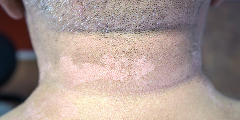 Figuur 2 | Hypopigmentatie in de nek na topicale behandeling met een corticosteroïdzalf