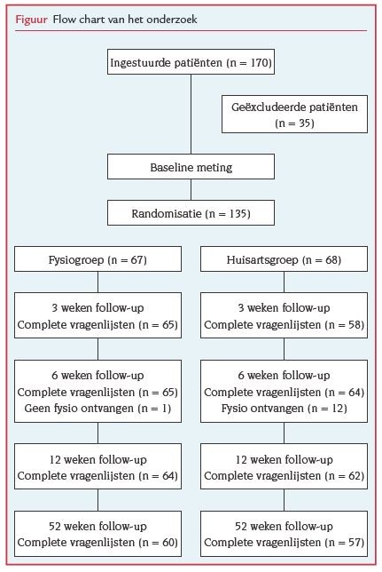 We konden 135 patiënten includeren en randomiseren; 67 patiënten ontvingen fysiotherapie toegevoegd aan de huisartsbehandeling (fysiogroep) en 68 patiënten ontvingen alleen de huisartsbehandeling (huisartsengroep). Direct na randomisatie trokken 4 patiënten zich terug; 1 in de fysiogroep en 3 in de huisartsengroep. De figuur laat de flow chart zien van het onderzoek.