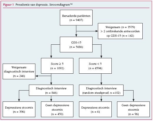 In ons onderzoek wilden we allereerst meer weten over de omvang van het probleem. Hoe vaak komt een depressie eigenlijk voor bij ouderen? Voor een antwoord op deze vraag screenden we een grote groep 55-plussers in West-Friesland en de regio Amsterdam op depressie. In totaal deden 58 huisartsen mee met het onderzoek: 17 uit verstedelijkt gebied en 41 van het platteland. We vroegen mensen van 55 jaar en ouder die de huisarts bezochten om de GDS-15 in te vullen. Het maakte hierbij niet uit wat de reden van het consult was, dus ook mensen die zich niet meldden met psychische klachten deden aan ons onderzoek mee. De GDS-15 is een screeningslijst met 15 items over somberheid in de afgelopen 4 weken.1112 De lijst is onder andere gevalideerd voor gebruik in de huisartsenpraktijk.13 Bij een score van 5 of hoger is er sprake van depressieve klachten die klinisch relevant zijn. We nodigden mensen met een score van 5 of hoger binnen 2 weken uit voor een diagnostisch interview. Hiervoor gebruikten we de stemmingsmodule van de PRIME-MD. Deze vragenlijst vraagt de 9 DSM-criteria voor een depressieve stoornis uit. Er was sprake van een depressieve stoornis bij een score van 5 of hoger op de GDS-15 en een positieve uitkomst in het diagnostisch interview. De mensen met een score van 5 of hoger op de GDS-15, maar met een negatieve uitkomst in het diagnostisch interview, definieerden we als mensen met een milde depressie. Om te kunnen corrigeren voor fout-negatieve uikomsten op de GDS-15 namen we bij een random steekproef van mensen met een score onder de 5 op de GDS-15 ook binnen 2 weken een diagnostisch interview af. In totaal vulden 5686 mensen de GDS-15 in; bij 846 mensen namen we tevens een diagnostisch interview af (figuur 1). Hieruit bleek dat 14% (95%-BI 8-20) van de 55-plussers die de huisarts bezochten een depressieve stoornis had. Daarnaast had nog eens 10% (95%-BI 8-12) een milde depressie. Dit betekent dat bijna 1 op de 4 55-plussers in de wachtkamer van de huisarts last heeft van somberheid. Het betrof vaker vrouwen en ze woonden vaker in de stad dan mensen zonder depressieve klachten. Van de mensen met een depressieve stoornis werd 23% behandeld met een antidepressivum.14