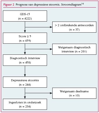 Licht-Strunk E: De prognose van depressieve 55-plussers in de huisartsenpraktijk: Om somber van te worden! Huisarts Wet 2009;52(11):522-6. Ons onderzoek naar de prevalentie en het beloop van depressie bij ouderen in de huisartsenpraktijk is een van de eerste op dit gebied. We namen bij 5686 55-plussers die de huisarts bezochten een depressiescreeningslijst af (de GDS-15) en nodigden hen bij een score van 5 of hoger uit voor een diagnostisch interview. Van deze groep had 14% een depressieve stoornis en 10% een milde depressie. We volgden een deel van de 55-plussers met een depressieve stoornis gedurende drie jaar; zij werden om de zes maanden geïnterviewd aan de hand van gevalideerde vragenlijsten. De mediane duur van een depressieve stoornis bleek 18 maanden. We zagen bij 35% van de deelnemers binnen een jaar herstel optreden, en bij 68% binnen drie jaar. Een op de drie mensen kreeg een behandeling tegen depressie. Een slechtere prognose bleek samen te hangen met de volgende factoren: 1) een ernstigere depressie tijdens de nulmeting, 2) een positieve familieanamnese voor depressie en 3) functionele beperkingen. De prognose is dus slecht en bij veel ouderen wordt de diagnose depressie niet of pas laat gesteld. De voorspellende factoren die we hebben geïdentificeerd kunnen in de toekomst mogelijk bijdragen aan het bieden van zorg op maat, waarbij mensen met een voorspelde slechtere prognose eerder starten met intensievere behandeling.