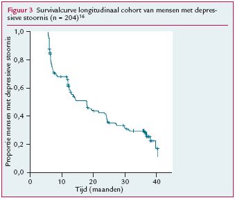 Depressie bij 55-plussers komt dus veel voor in de huisartsenpraktijk. Maar alleen zo’n prevalentie zegt nog weinig. Voor een zinnige uitspraak over de relevantie van deze getallen moeten we weten wat de prognose van depressie bij hen is. In een literatuuronderzoek vonden we slechts 4 cohortonderzoeken die in de eerste lijn waren uitgevoerd.15 De follow-up was 6 tot 12 maanden. Omdat we dit een wat beperkte opbrengst vonden, keken we ook naar onderzoeken die in de open bevolking waren uitgevoerd. Dit waren er 17, met een maximale follow-up van 10 jaar. Binnen 1 jaar herstelde 23 tot 51% van de depressieve ouderen. Bij 32 tot 54% duurde de depressie zelfs langer dan 3 jaar. Onderzoeken waarbij meer dan 2 opeenvolgende metingen in de tijd zijn gedaan, lieten zien dat depressie vaak een fluctuerend beloop heeft. In ons eigen onderzoek interviewden we de deelnemers uit West-Friesland met een depressieve stoornis elk halfjaar, gedurende 3 jaar.16 Tijdens elke meting brachten we onder andere de ernst van de depressieve klachten in kaart. In totaal waren 234 55-plussers met een depressieve stoornis bereid om deel te nemen aan dit longitudinale deel van het onderzoek (figuur 2). In tabel 1 zijn een aantal karakteristieken van de deelnemers tijdens de nulmeting opgenomen. We gebruikten de gegevens van de 204 (87%) deelnemers met 2 of meer metingen voor de longitudinale analyses. Uitvallers waren wat ouder, maar er was geen verschil in ernst van depressie of andere karakteristieken. Herstel van depressie was gedefinieerd als het niet meer voldoen aan de DSM-criteria voor depressie én een score onder de 10 op de MÅDRS. Deze vragenlijst (score 0-60) is ontwikkeld om de verandering in ernst van depressieve klachten in de tijd te meten.1718 De mediane duur van een depressieve stoornis in ons cohort was 18 maanden (figuur 3); 35% van de deelnemers herstelde binnen een jaar en 68% binnen 3 jaar. Deze getallen zijn in overeenstemming met de uitkomsten van onderzoeken die we in het literatuuronderzoek gevonden hadden.15 De prognose van depressie bij ouderen lijkt dus slecht. Een van de argumenten die daarvoor aangedragen wordt, is dat depressie te vaak gemist zou worden. Als een diagnose niet gesteld wordt, vindt er geen behandeling plaats en kan de uitkomst slecht zijn. Dat lijkt een logische redenatie. Daarom vroegen we ons af wat de prognose was van mensen met een depressieve stoornis die niet door de huisarts gediagnosticeerd werd. Voor een antwoord op deze vraag analyseerden we de gegevens van deelnemers uit een representatieve subgroep van praktijken.19 Het betreft een cohort met 73 deelnemers (tabel 2, op de website). Het bleek dat bij tweederde van hen (67%, 49 mensen) tijdens een jaar follow-up de diagnose depressie niet gesteld werd, en dus ook geen depressiebehandeling gestart werd. Na een halfjaar was 22% van hen hersteld, en na een jaar 37%. Dit betekent dat de depressieve stoornis na een jaar nog steeds aanwezig was bij tweederde van de deelnemers met een niet-gediagnosticeerde depressie. Deze percentages waren hetzelfde bij mensen die wel een diagnose en behandeling voor depressie hadden gekregen. Dit wil overigens niet zeggen dat behandeling niet effectief is; de depressies in deze herkende groep waren ernstiger. Deze bevinding bevestigden we met de analyses van de gegevens na 3 jaar: behandeling was geen voorspeller van de prognose, maar mensen die behandeld werden hadden wel ernstigere depressieve klachten.