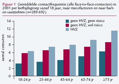 Ook al zijn er enorme uitschieters, het aantal contacten loopt duidelijk op met het aantal risicofactoren (tabel). Negen van de 10 mensen hebben geen risicofactoren voor hart- en vaatziekten, maar als er sprake is van risicofactoren gaat het in 63% van de gevallen om hypertensie (niet in tabel).