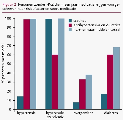 Primaire preventie van hart- en vaatziekten betekent dat huisartsen bij patiënten extra alert zijn op risicofactoren en deze adequaat behandelen. De belangrijkste risicofactoren voor hart- en vaatziekten zijn: hypertensie, overgewicht, hypercholesterolemie en diabetes mellitus. Bij wijze van eerste inventarisatie onderzoeken we contactfrequenties en de soort medicatie die huisartsen voorschrijven in relatie tot deze risicofactoren. Mensen met risicofactoren hebben bijna evenveel contacten met de huisarts als patiënten met hart- en vaatziekten (figuur 1).