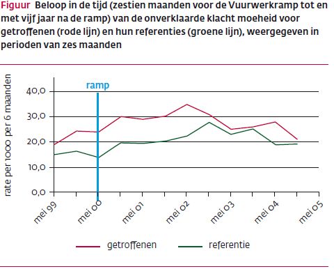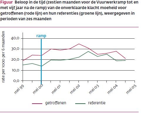 Onderzoek in huisartsenpraktijken na de Bijlmerramp, de Vuurwerkramp, de Nieuwjaarsbrand en het schietincident in Alphen geven allemaal hetzelfde beeld: patiënten die een ramp hebben meegemaakt, hebben dezelfde klachten als patiënten in de open populatie (moe, hoofdpijn, benauwd, nekpijn) maar meer, vaker en met een grotere diversiteit. In de [figuur] is duidelijk het beloop van de klacht moeheid te zien: gedurende drie jaar na de Vuurwerkramp presenteerden getroffenen dit symptoom gemiddeld 1,5 keer zo vaak als de niet-getroffen referentiegroep. Daarbij bleef uiteindelijk 91% van de gevallen onverklaard. Bij hoofdpijn was het deel onverklaard 86% en bij benauwdheid 56%.