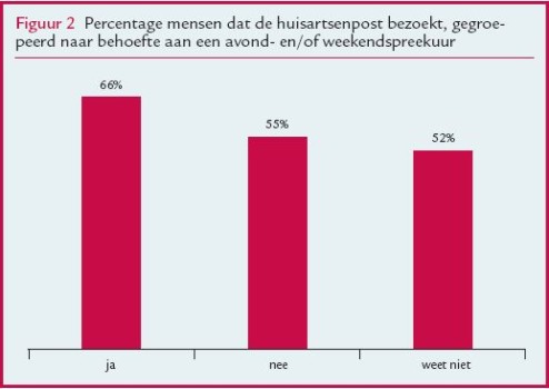 De overbelasting van de huisartsenposten roept de vraag op of het in ere herstellen van een avond- en/of weekendspreekuur een oplossing kan bieden. Bijna een kwart van de ondervraagden zegt behoefte te hebben aan zo’n spreekuur. Opvallend is dat degenen die hieraan behoefte hebben vaker bij de huisartsenpost zijn geweest dan degenen die hieraan geen behoefte hebben of dit niet weten. Mogelijk zouden deze mensen eerder naar hun eigen huisarts gaan dan naar de huisartsenpost als hun eigen huisarts een avond- en/of weekendspreekuur zou hebben. Dan zouden er minder mensen naar de huisartsenpost gaan. Een andere oplossing is het geven van voorlichting: met welke klachten ga je naar de huisartsenpost en met welke niet. Gezien het feit dat patiënten hun bezoek aan de huisartsenpost vrijwel altijd terecht vinden, is het echter maar de vraag of dergelijke voorlichting zin heeft.