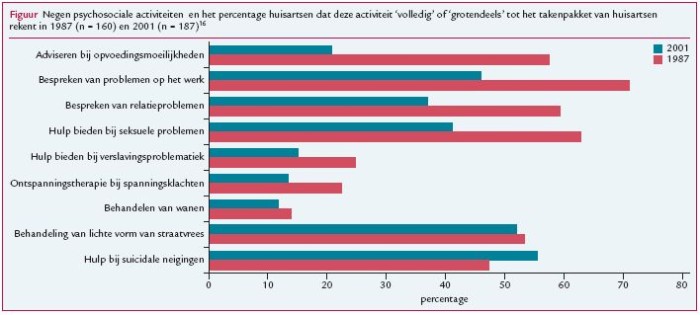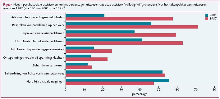 - Huisartsen diagnosticeerden in 2001 een kwart minder psychosociale problemen dan in 1987 en rekenden de behandeling daarvan in mindere mate tot hun takenpakket dan in 1987.
