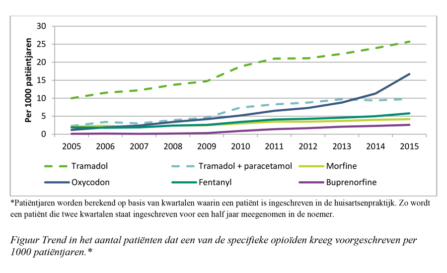 In de periode van 2005 tot 2015 was in Nederland een stijging te zien in het voorschrijven van opioïden. Dit was vooral het geval voor sterkwerkende opioïden, het aantal patiënten met een voorschrift was verzesvoudigd. Opvallend was met name de stijging in het voorschrijven van het sterkwerkende oxycodon [figuur]. Dit is in tegenspraak met de NHG-Standaard Pijn die morfine als eerste keus van sterkwerkende opioïden vermeldt. Opioïden werden het vaakst voorgeschreven voor aandoeningen en klachten van het bewegingsapparaat, zowel bij zwakwerkende (72,1%) als bij sterkwerkende opioïden (61,5%). Ongeveer 30% van alle patiënten kreeg het opioïde voor 3 maanden of langer voorgeschreven.