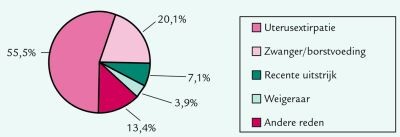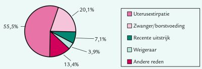 Aan het bevolkingsonderzoek in 2000 nam 33,7% van de vrouwen niet deel. Een derde van deze vrouwen had een in het HIS geregistreerde reden om niet deel te nemen, zoals verwijdering van de baarmoeder, zwangerschap of het recent hebben ondergaan van een uitstrijk ( figuur 2).