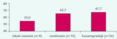 Vrouwen worden op drie verschillende manieren uitgenodigd voor het bevolkingsonderzoek: ze ontvangen uitnodigingen via hun huisarts óf via een lokale instantie (bijvoorbeeld GGD), óf er is sprake van een combinatie waarbij een eerste uitnodiging via de lokale instantie komt en vrouwen – indien nodig – vanuit de huisartspraktijk een herinnering krijgen toegestuurd. De praktijken varieerden onderling sterk qua opkomstcijfers. De belangrijkste determinant van de opkomst bleek het uitnodigingssysteem. Een uitnodigingssysteem waarin de huisartspraktijk participeert, geeft al een aantal jaren een 10 tot bijna 14% hogere opkomst ( figuur 3).