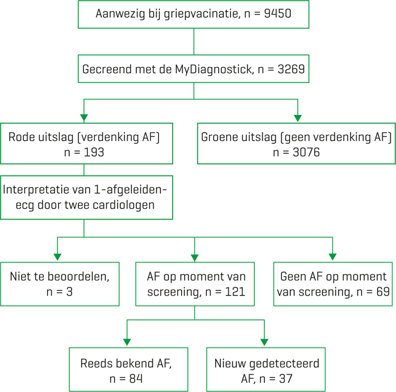 De griepvaccinatie lijkt een goede setting om op AF te screenen omdat er veel patiënten op 1 moment bij elkaar zijn. Bovendien komen de selectiecriteria voor de griepvaccinatie grotendeels overeen met de risicofactoren voor AF en hebben de bezoekers van de griepvaccinatie waarschijnlijk een verhoogd risico op AF. Voor dit onderzoek screende een team van 4 onderzoeksverpleegkundigen met de MyDiagnostick op AF tijdens griepvaccinatiesessies in 10 huisartsenpraktijken [figuur 1].13 De onderzoeksverpleegkundigen werden vrij gelaten om patiënten te selecteren voor screening, waardoor onze aanpak zo veel mogelijk overeenkwam met de wijze waarop de screening in de praktijk verloopt. Ze screenden in totaal 3269 patiënten, 35% van alle bezoekers van de griepvaccinatiesessies. Vooral oudere patiënten werden gescreend; de gemiddelde leeftijd van de gescreende groep was 69,4 jaar en van de ongescreende groep 60,8 jaar. In totaal hadden 193 mensen een positieve uitslag en bij 37 (1,1% van de gescreende groep) van hen werd AF bevestigd met de 1-afgeleiden-ecg, geïnterpreteerd door twee cardiologen. Dat betekent dat er 91 mensen moeten worden gescreend om 1 nieuwe diagnose AF te stellen (number needed to screen). Alle 37 gedetecteerde AF-patiënten waren ≥ 60 jaar. De detectiegraad nam toe met de leeftijd: van 0,9% bij 60 tot 64 jaar tot 4,9% bij ≥ 85 jaar. De meeste nieuw ontdekte AF-patiënten kwamen in aanmerking voor antistollingsbehandeling (78% had een CHA2DS2-VASc-score ≥ 2).