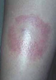 - een rode of blauwrode vlek krijgt in combinatie met griepachtige klachten zoals koorts, hoofdpijn of spierpijn;