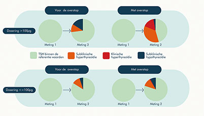 Van de patiënten die in 2014 meer dan 100 μg Thyrax® per dag gebruikten en die bij de eerste meting een normale TSH-waarde hadden, had 27% bij de tweede meting, zonder dosisaanpassing, een TSH-waarde buiten de referentiewaarden. Van degenen die minder dan 100 μg Thyrax® gebruikten, had 16% bij de tweede meting een TSH-waarde buiten de referentiewaarden ([figuur], deelonderzoek 1).