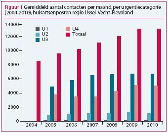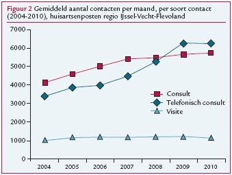 De percentuele verdeling tussen telefonisch consult, consult en visite is in de periode 2004-2010 veranderd (zie figuur 2). Het aantal telefonisch afgehandelde contacten is maar liefst met 85% toegenomen. Het aantal consulten is met 39% toegenomen en het aantal visites is min of meer gelijk gebleven. In 2010 bedroeg de percentuele verdeling telefonisch consult, consult en visite respectievelijk 47,7%, 43,7% en 8,6%. In 2004 was deze verdeling respectievelijk 39,8%, 48,7% en 11,5%.