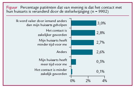 De vraag of mensen het gevoel hebben dat ze vaker bij hun huisarts moeten (terug)komen door de stelselwijziging beantwoordt 3% (van de 9897 mensen) met ja. Ongeveer 2% zegt dat ze door de stelselwijziging vaker bij de huisarts komen, omdat ze voor elke klacht een aparte afspraak moeten maken. Ongeveer 1% zegt dat hij/zij door de stelselwijziging vaker terug moet komen voor controle en eveneens bijna 1% noemt een andere reden waarom ze vaker bij de huisarts langsgaan.