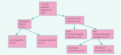 Bij de selectie werden 115 patiënten met hart- en vaatziekten gevonden die voldeden aan de leeftijdscriteria ( stroomschema). Mannen waren enigszins in de meerderheid. Bij 31 patiënten was het cholesterol bekend. Bij de helft van deze patiënten voldeed de spiegel aan de criteria van de nieuwe NHG-Standaard: een cholesterol lager dan 5,0 mmol/l (6 patiënten) en/of een maximale dosis van een statine (tien patiënten). De vijftien patiënten met een bekend verhoogd cholesterol werden onder de aandacht van hun eigen huisarts gebracht. Zij werden in dit onderzoek niet verder vervolgd omdat het doel het opsporen van onbekende patiënten was.