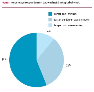 Dat roept de vraag op wat patiënten een acceptabele wachttijd vinden. Van de respondenten vindt maar 11% een wachttijd langer dan twee minuten acceptabel voordat de telefoon wordt opgenomen, 56% wil zelfs binnen één minuut te woord worden gestaan. De respondenten oordelen dus strenger over een acceptabele wachttijd dan de IGZ.