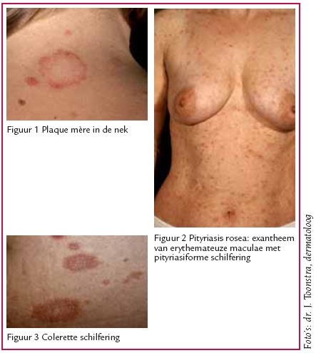 Pityriasis rosea begint in 80% van de gevallen met een scherp begrensde ronde of ovale erythemateuze macula of plaque met lichte schilfering op een dij, bovenarm of romp dan wel in de nek en die in korte tijd zijn maximale grootte van twee tot vijf centimeter bereikt (figuur 1). Deze primaire plek heet de plaque mère, de moederplek. Na gemiddeld vijf tot vijftien dagen ontstaat het exantheem, dat zich een dag of tien later niet verder uitbreidt. Het is te vinden op de romp, in de hals, op de bovenarmen en de bovenbenen. De laesies zijn kleiner dan de plaque mère, ovaal van vorm, rozerood van kleur en veel laesies hebben een fijne ‘pityriasiforme’ schilfering (figuur 2). De wat grotere plekken bleken later in het midden op en hebben een ‘colerette’ (kraagvormige schilfering), waarbij de vrije schilferrand naar het centrum is gericht (figuur 3). In zijn klassieke verschijningsvorm verlopen de lange assen van de ovale vlekjes volgens de splijtlijnen van Langer, zodat er op het bovenste deel van de romp een ‘kerstboomconfiguratie’ zichtbaar wordt. De oorzaak van een pityriasis rosea is waarschijnlijk (post)infectieus, maar het infectieuze agens is niet geïdentificeerd en de aandoening is niet besmettelijk. Het komt vooral voor bij adolescenten en jongvolwassenen (tussen de 10 en 35 jaar). De aandoening geneest altijd vanzelf. Complicaties treden niet op. Eventuele jeuk kan – als die ernstig is – worden bestreden met hydrocortison- of triamcinolonzalf FNA of met orale sederende antihistaminica (geen gecontroleerd onderzoek naar effectiviteit verricht).