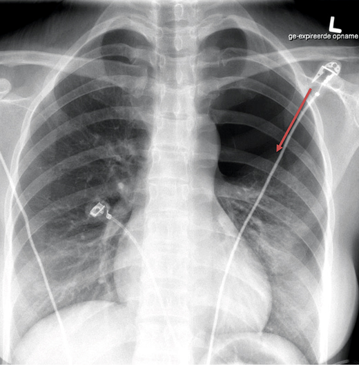 Een 33-jarige vrouw bezocht de huisarts wegens pijn op de borst. Een dag eerder had zij een acupunctuurbehandeling ondergaan voor pijnklachten in de rug. Daarbij waren naalden geplaatst op onder meer de rug en de schouders. Vlak na deze behandeling kreeg de patiënte last van nieuwe pijnklachten in de rug, later ook op de borst. De pijn op de borst werd erger bij diepe inademing en er was sprake van dyspneu. Bij auscultatie van de longen was links verminderd ademgeruis hoorbaar en aan de linkerzijde van de thorax was er een hypersonore percussie. De patiënte had een regulaire tachycardie van 110/min en een saturatie van 100%. De huisarts verwees haar door voor een röntgenfoto van de thorax. De beschrijving van de radioloog luidde: pneumothorax links apicaal en ventraal; geen aanwijzingen voor een spanningscomponent; rechterlong goed ontplooid, slank cardiomediastinum. De patiënte bezocht de Spoedeisende Hulp, waar een thoraxdrain geplaatst werd zonder dat er verdere complicaties optraden [figuur 1].