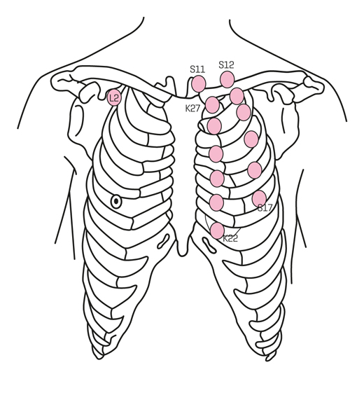 Acupunctuurpunten waarbij het risico op beschadiging van de longen verhoogd is, zijn gerelateerd aan de maag (S11-17), de nier (K22-27) en de long (L2)