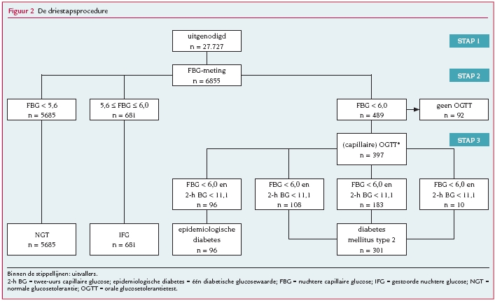 Uit kostenoverwegingen beperkten wij ons in deze procedure tot capillaire metingen en voerden wij geen glucosemetingen uit buiten kantooruren. Personen met een score van 6 of meer op de risicovragenlijst nodigden wij uit voor stap 2, een FBG-meting; de RBG-meting verviel. Bij personen met een FBG > 6,0 mmol/l volgde stap 3, een OGTT met capillaire glucosebepaling. Resulteerde de OGTT in een diabetische glucosewaarde, dan stelden wij de diagnose diabetes, zo niet dan was de diagnose epidemiologische diabetes. Deelnemers met een FBG tussen 5,6 en 6,0 mmol/l classificeerden wij als IFG; zij kregen geen OGTT.