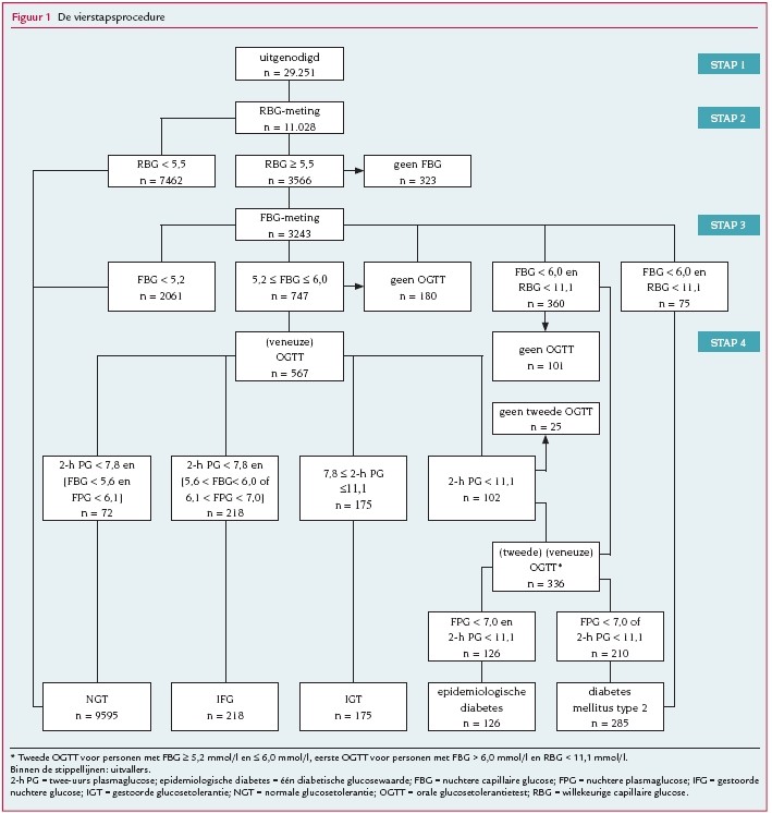 De eerste stap van deze screeningsprocedure bestond uit de risicovragenlijst. Deelnemers met een score hoger dan vier punten ontvingen, als tweede stap, een uitnodiging voor een willekeurige capillaire glucosemeting (random blood glucose, RBG). De vierstapsprocedure was opgezet om behalve op diabetes ook op impaired glucose tolerance (IGT) te screenen (de nuchtere glucosewaarde is dan normaal maar de twee-uurswaarde is licht verhoogd tot 7,8-11,0 mmol/l). Daarom was het afkappunt in deze procedure twee punten lager dan in de driestapsprocedure. Als derde stap voerden wij bij personen met een RBG ≥ 5,5 mmol/l een nuchtere glucosemeting uit (fasting blood glucose, FBG). Deelnemers met een RBG ≥ 11,1 mmol/l en een FBG > 6,0 mmol/l kregen de diagnose diabetes. Deelnemers met een FBG > 6,0 mmol/l maar een RBG < 11,1 mmol/l werden – als vierde stap – uitgenodigd voor een standaard 75 gram orale glucosetolerantietest (OGTT). Bij de OGTT controleerden wij de waarden in veneus bloed of plasma. Indien de nuchtere glucosewaarde in veneus plasma (fasting plasma glucose, FPG) ≥ 7,0 mmol/l was, of de twee-uurs plasmaglucosewaarde (two hours plasma glucose, 2-hPG) ≥ 11,1 mmol/l, stelden wij de diagnose diabetes. Personen bij wie de OGTT geen diabetische glucosewaarde aangaf, categoriseerden wij als ‘epidemiologische diabetes’: in het screeningsprogramma is één diabetische glucosewaarde gevonden, maar dit is onvoldoende om de klinische diagnose diabetes te stellen. Ook deelnemers met een FBG tussen 5,2 en 6,0 mmol/l ondergingen als vierde stap een OGTT. Indien de OGTT bij deze personen een 2-hPG ≥ 11,1 mmol/l aangaf (hun eerste diabetische glucosewaarde), kregen zij een tweede OGTT. Deelnemers met een 2-hPG ≥ 7,8 mmol/l maar < 11,1 mmol/l classificeerden wij als IGT, deelnemers met 2-hPG < 7,8 mmol/l classificeerden wij als impaired fasting glucose (IFG) indien hun FBG tussen 5,6 en 6,0 mmol/l lag, dan wel hun FPG tussen 6,1 en 7,0 mmol/l. IFG wil zeggen dat de nuchtere glucosewaarde verhoogd maar niet-diabetisch is, en de twee-uurswaarde normaal. Tot besluit stuurden wij de deelnemers een brief met de resultaten van de glucosemetingen en bespraken we de implicaties met hen. Ook hun huisartsen werden hiervan in kennis gesteld.