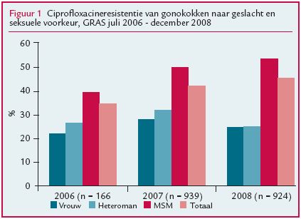 De eerder beschreven toenemende resistentie heeft doorgezet. Gegevens van 2006 tot en met 2008 laten een voortgaande stijging van resistentie tegen ciprofloxacine zien, tot zelfs 46% in 2008 (figuur 1). Gonokokken, geïsoleerd bij mannen die seks hebben met mannen (MSM), waren in 2008 voor meer dan 50% resistent. Bij heteroseksuele personen was dit ongeveer 25%.