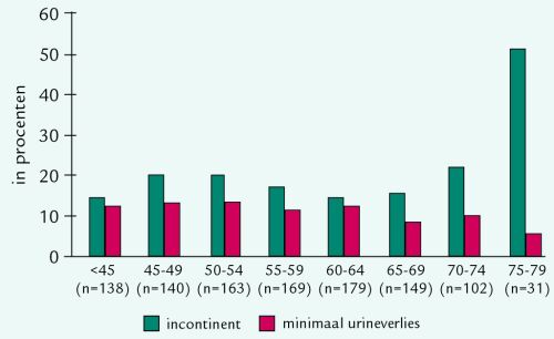 In totaal retourneerden 1071 vrouwen de enquête (respons van 73%). Ongeveer 1% van de geretourneerde vragenlijsten was onvolledig ingevuld. De respondenten hadden een gemiddelde leeftijd van 56,9 jaar (spreiding: 29-79 jaar). De gemiddelde pariteit bedroeg 2,6. Honderdvijfenveertig vrouwen (13,5%) waren kinderloos. Op basis van de combinatie van de 4 incontinentievragen bleek bijna 19% (95%-BI 16,2-21,0) van de vrouwelijke bevolking ouder dan 30 jaar ernstig incontinent te zijn, bijna 12% (95%-BI 9,6-13,6) was minimaal incontinent en 69% (95%-BI 66,4-72,0) was niet incontinent. Het totale prevalentiecijfer (ernstige en minimale incontinentie samen) kwam daarmee op 30% (95%-BI 27-33). Er bleek geen correlatie te bestaan tussen het aantal kinderen en incontinentie. Er werd geen leeftijdsafhankelijkheid gevonden bij vrouwen onder de 70. Alleen bij vrouwen met een leeftijd tussen 70 en 80 jaar werd significant vaker incontinentie aangetroffen dan bij jongere vrouwen ( figuur 1). Op de rechtstreekse vraag of men ‘wel eens urine verliest’ antwoordde bijna 40% (95%-BI 36,7-42,7) van de vrouwen bevestigend. Meer dan een kwart van de vrouwen die deze vraag positief beantwoordden, bleek slechts incidenteel een druppel urine te verliezen.